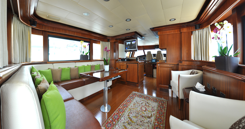On the upper deck, there is a second large lounging area complete with alfresco dining table for memorable meals together under a fiery sunset sky. The skylounge provides a quiet alternative retreat out of the sun; large windows stream through the sunlight and guests also have a view of the helm.