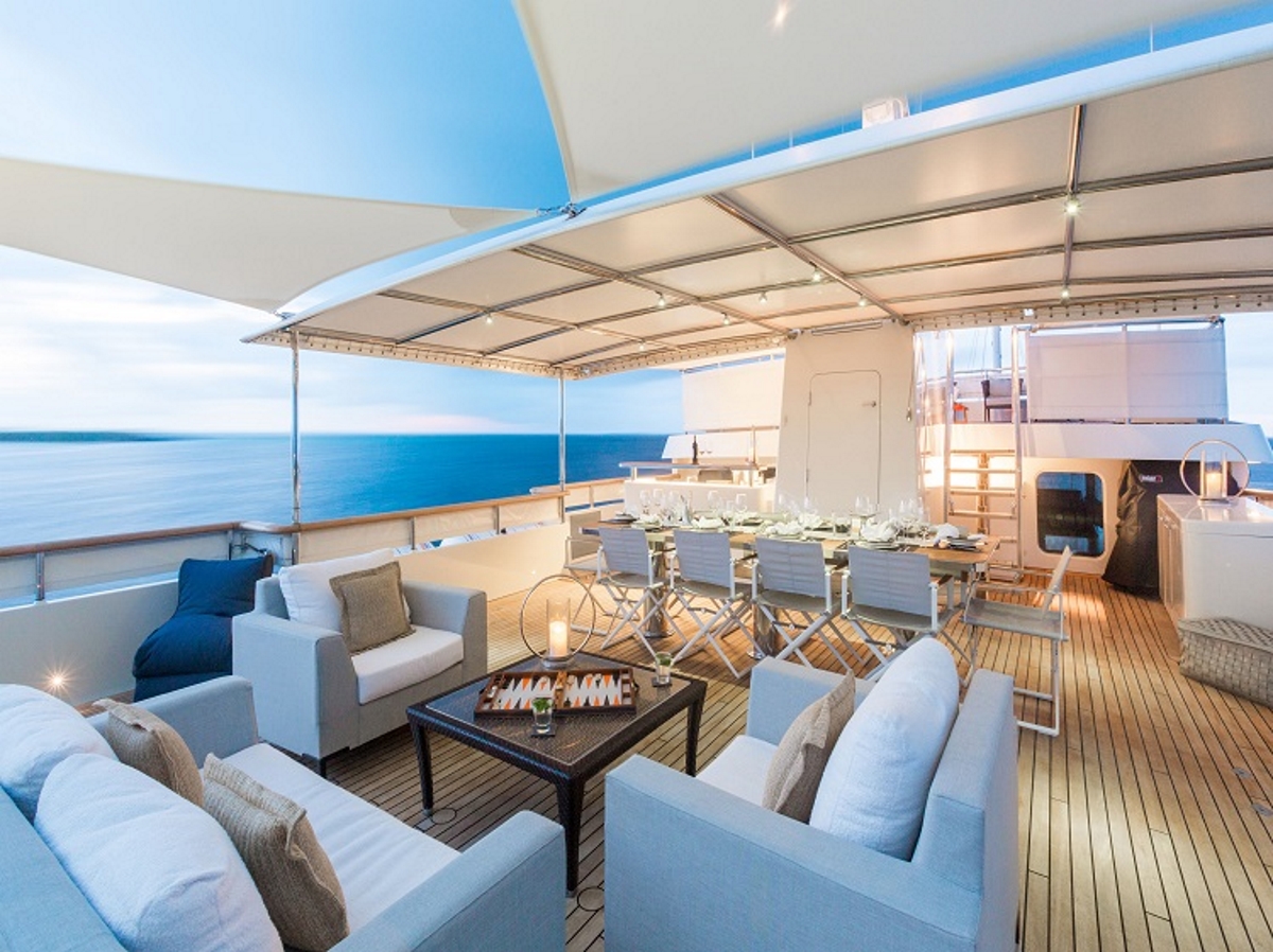 The upper deck hosts the Master suite and a private lounge for a tranquil indoor environment away from the main group. Outside, the upper deck aft is designed for entertaining and guests have the choice of dining alfresco with a drink from the nearby bar, or lounging on the comfortable stern seating for a languid afternoon of chatting as a group or simply spending some time listening to music or reading.