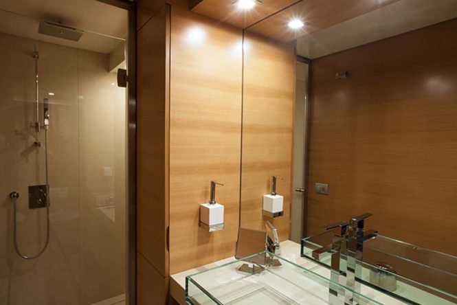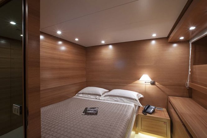 The on board accommodation provides for 8 guests over 4 cabins: 1 Master suite, 1 VIP stateroom, 1 double cabin and 1 twin cabin. The professional crew of 4 will ensure that everyone on board has fantastic charter experience wherever you travel.