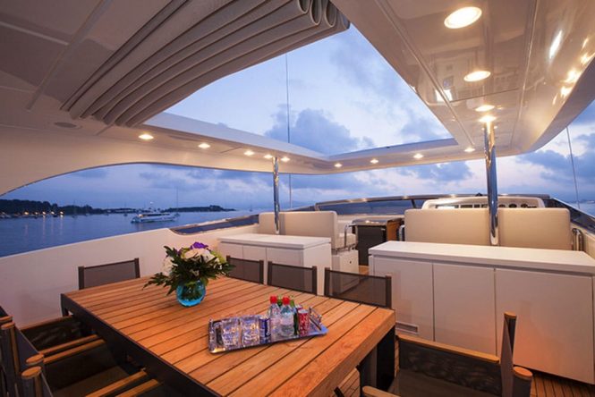 Above, the sundeck has plenty of sun loungers along the stern to take in the views while resting. Two sofas provide a place for guests to sit and chat before an alfresco meal beneath the automated opening roof.
