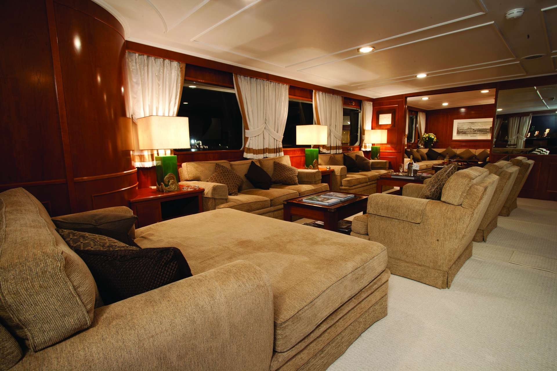 Her interiors are contemporary, featuring a neutral palette of soft furnishings, paired seamlessly with timeless fixtures and fittings, creating a beautiful blend of modern meets classic. The main salon offers sumptuous furnishings comprising a large sofa, armchairs and a coffee table situated on the port side, while on starboard is a table, perfect for games. Forward and amidships is a separate formal dining room for 12.