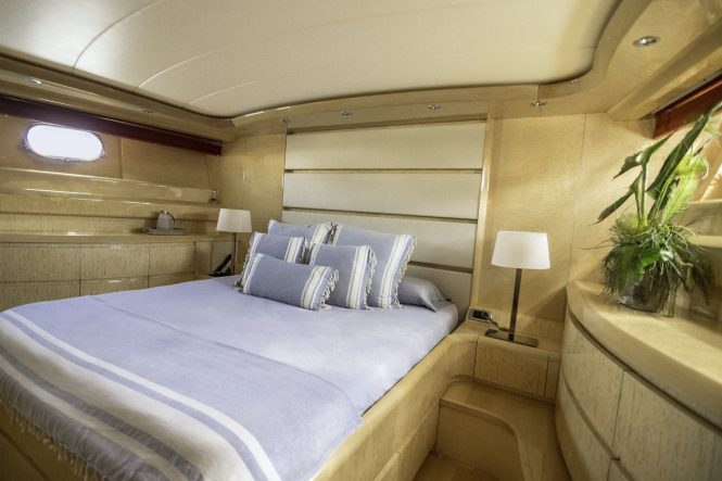 The accommodation sleeps a total of 7 guests over 4 en-suite cabins: 1 Master suite, 1 VIP stateroom and 2 twin cabins that both have a Pullman berth.