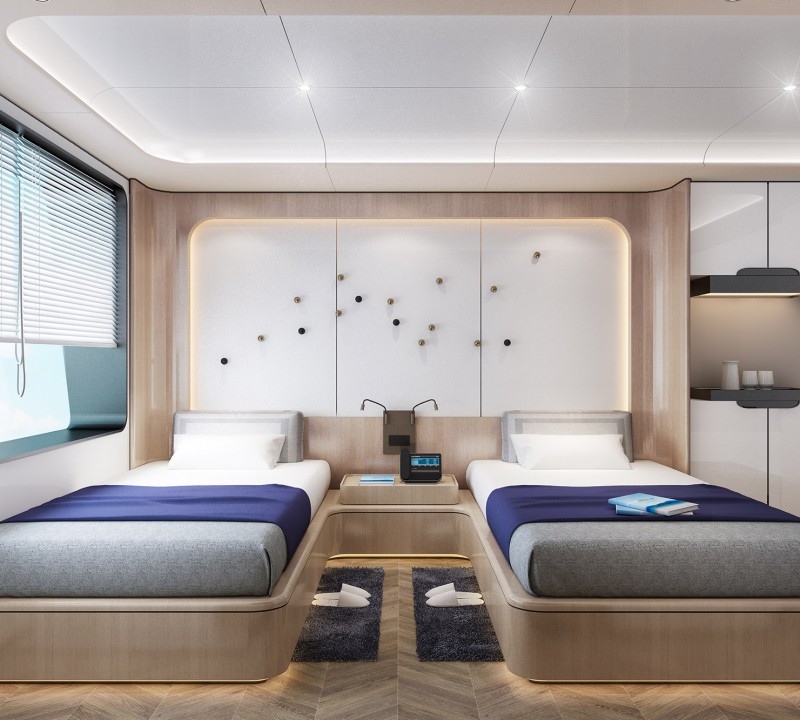 The interiors are designed to be light, bright and contemporary to be a tranquil haven during your exotic adventure: Dusky-white furnishings and slate-grey accents contrast the earthy golden tones of the wood flooring and panelling. The main deck dining area provides several tables for more intimate meals between guests, with plush sofa seating for unwinding and spending time on hobbies with access to the bar for tea, coffee and spirits to suit the time of day. Father forward, there is an entertainment salon with gym equipment, games consoles and a business centre.