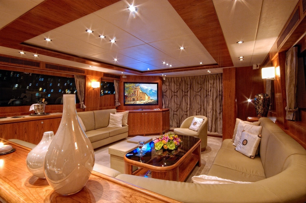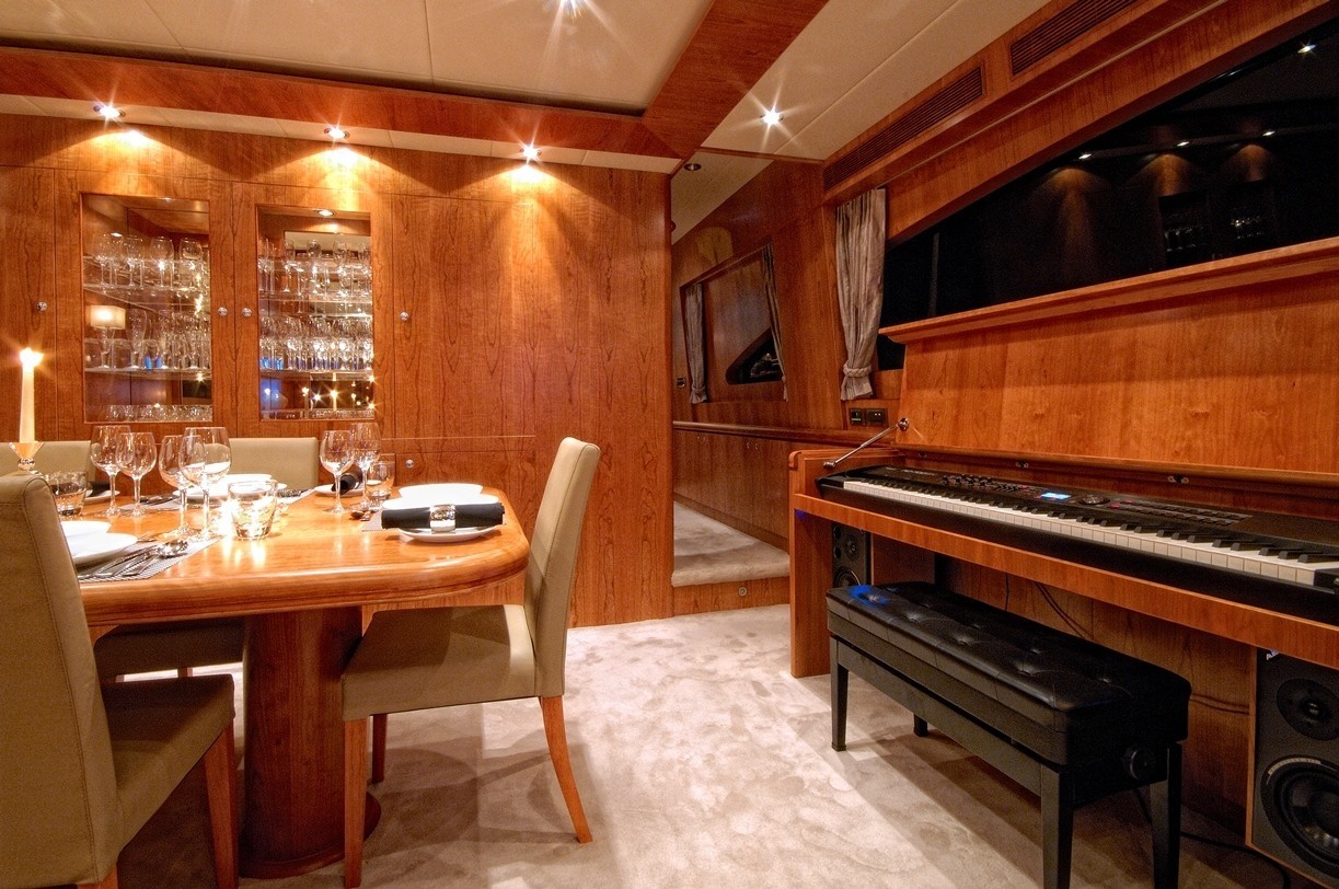The formal dining area seats up to six guests for an intimate meal between family and friends, while the aft lounge is fitted with a widescreen TV and the latest Bose speakers for high quality viewing form the L-shaped sofa.