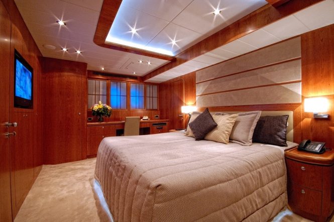 Outside, guests have plenty of choice on where to spend their time, with the aft main deck providing a long sofa and an oval table for casual alfresco meals. Below, the broad swim platform has plenty of room for sun bathing beside the water, or alternatively guests can take to the sunpads on the bow or sit back in the sofa to take in the forward views.