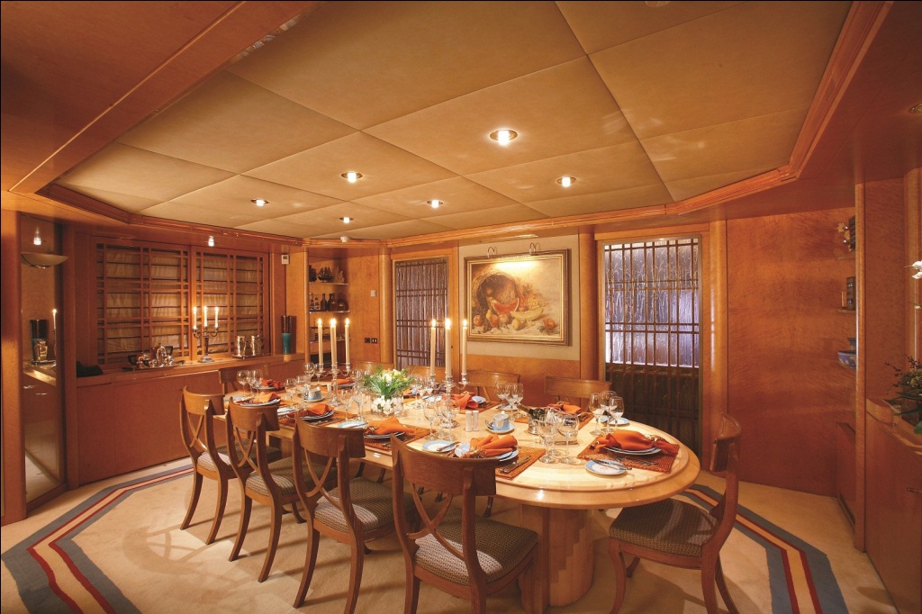 Forward of the main salon, the formal dining area has its own separate space within inviting, timeless surroundings ideal for family get-togethers and private celebrations.