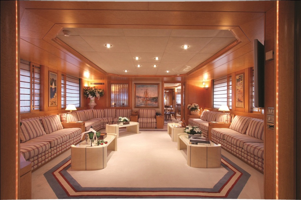 The main salon features angire-like panelling for a bright environment that complements the natural tones of the fabric furnishings. Sofas line either side of the salon to create a space for standing or for any shopping bags after a fruitful shopping trip to Greece and Croatia’s many boutique stores.