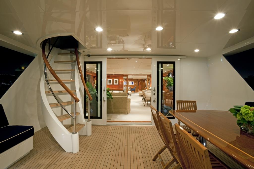 The main deck uses a spacious open-plan layout that can be divided up with glass sliding doors to create two separate salons: A games room and conversation area to the aft, and a TV room containing deep plush sofas and armchairs beside the formal forward dining area to the centre. Table lamps add to the evening ambiance and enhance the warmth of the wooden panelling and beautiful gloss finishes, while the elegant formal dining are is ideal for celebrating a special occasion with friends and family in style.