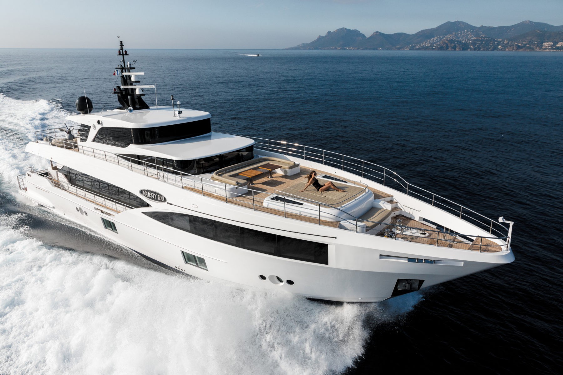 The main deck aft provides a comfortable place to dine alfresco, while the flybridge above has a wet bar for easy service as guests lounge in the outdoor seating. The swim platform can be used for sunbathing, but there’s no beating the massive sunbed on the foredeck and the C-shaped sofa with drinks tables to admire the views of the Cassis National Park, La Maddalena Archipelago or the colourful Cinque Terre settlements.