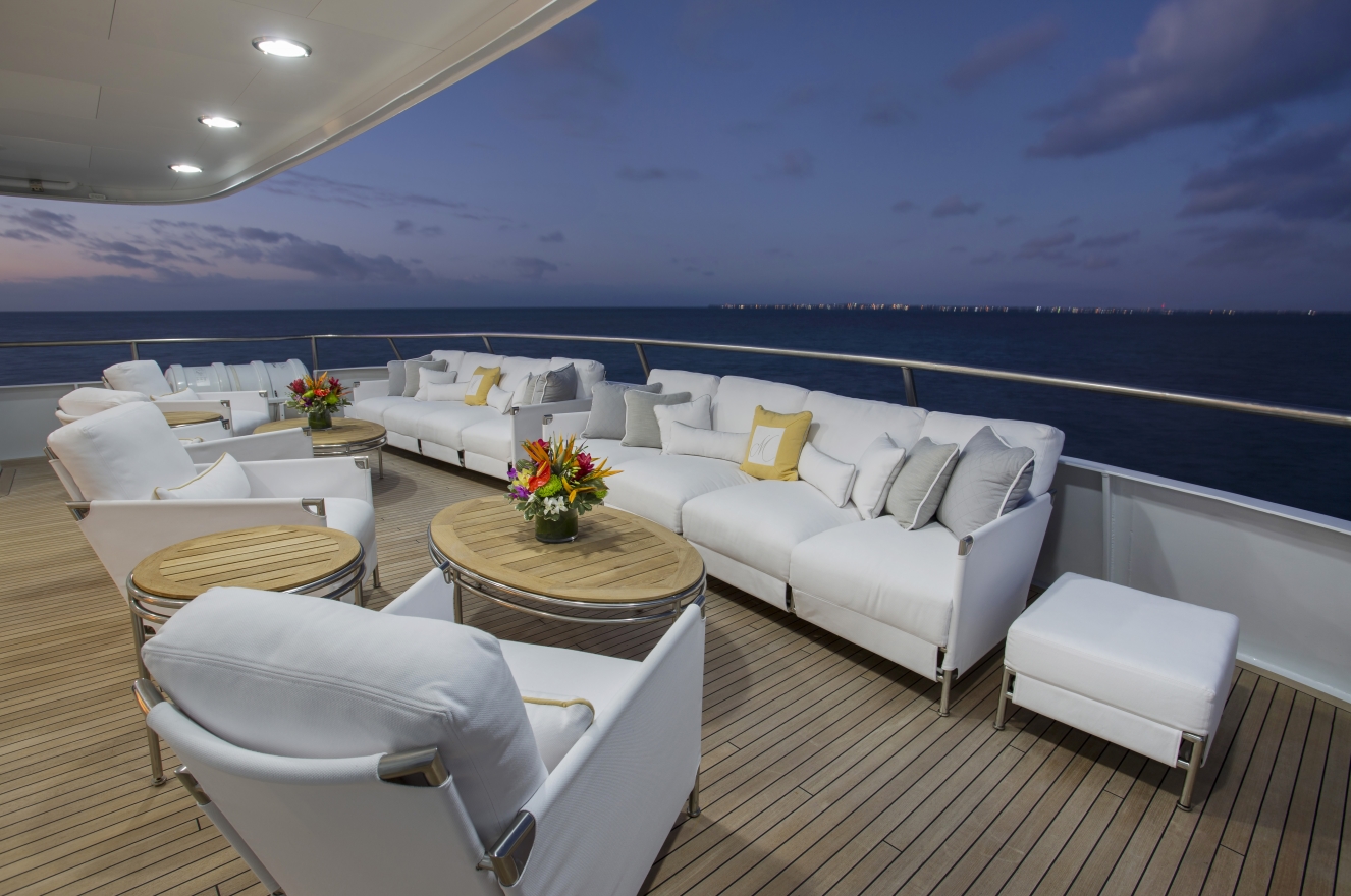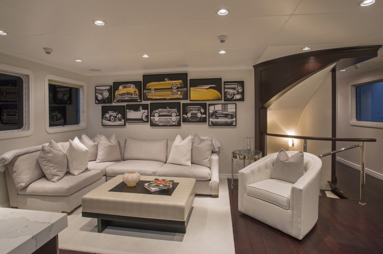 Her fully refurbished interior design boasts sophisticated contemporary styling, with wood flooring and finishing, beautiful carpets and fabrics in soft colours. The main salon has a generous lounge where charter guests can relax in the comfortable seating area and enjoy a refreshing drink at the full-service bar. There is also a game table, a media centre and a dining table for 12 people. The glass sliding doors provide direct access to the aft deck, which hosts a stunning alfresco dining area.