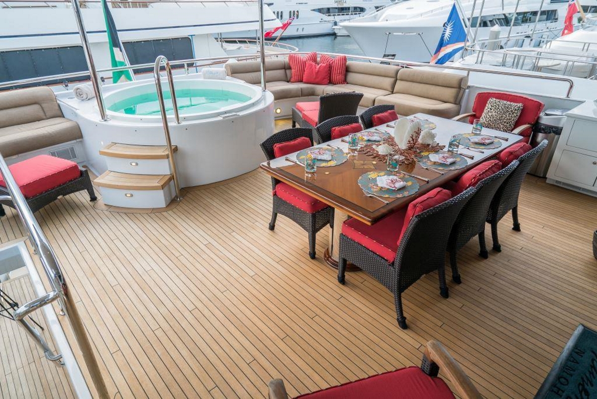 Alternatively, dine alfresco in the shade on the spacious main deck aft with the sound of water lapping at the hull. Steps lead down the hull to the swim platform for easy access to the tenders and the water toys. After playing along the beaches, settle into the seating along the stern for outdoor living in the sunshine.