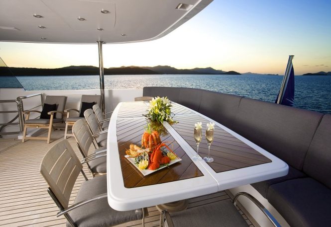 On the main deck aft two staircases lead down to the swim platform and tender garage for ease of access to the water toys and the sea. After hours of playing among the thriving underwater habitats, guests can return to the main deck aft to dry off on the sheltered seating area and take lunch alfresco.