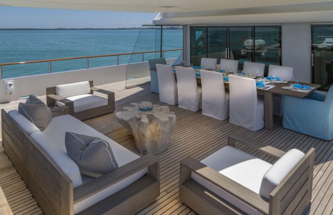 Outside, the main deck aft is just as extensive and provides a large shaded seating area as well as sunpads along the bow. Two sets of stairs lead to a large swim platform ideal for sunbathing and accessing the water toys and tenders.