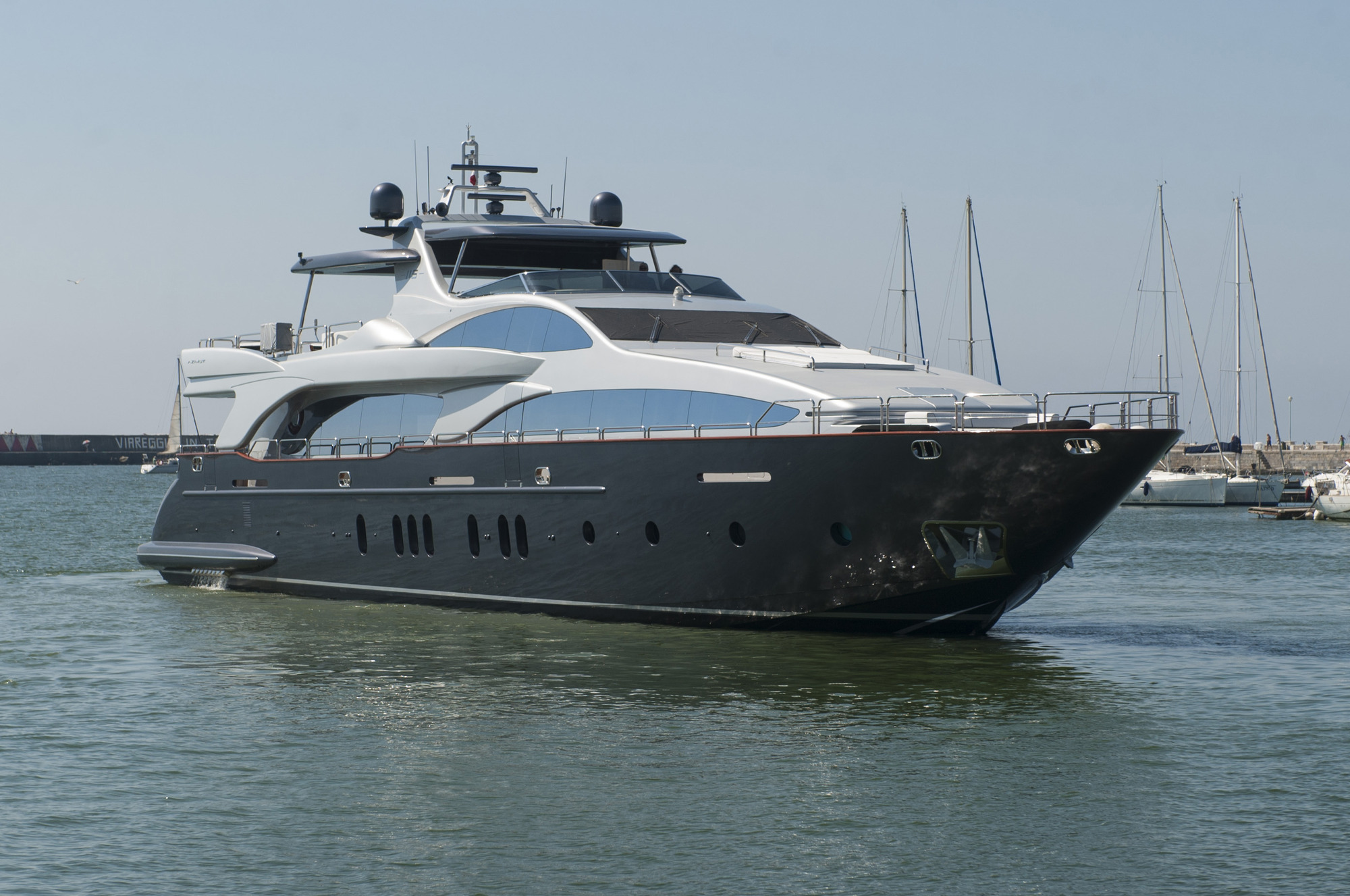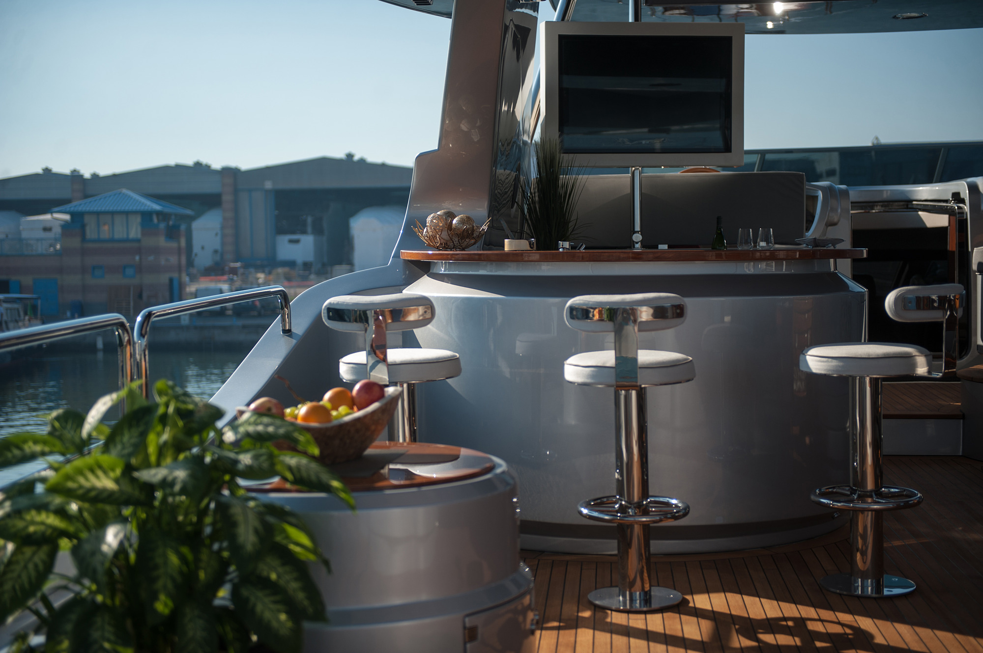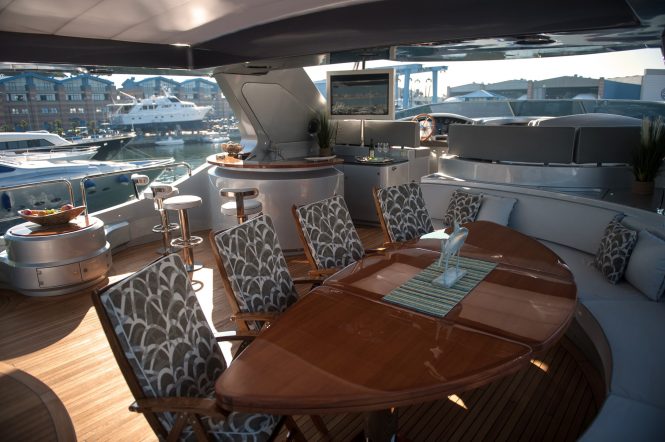 Above, the sundeck is laid out for entertaining and relaxation, with a central Jacuzzi taking pride of place between the aft sun loungers and the shaded forward seating with adjacent bar.