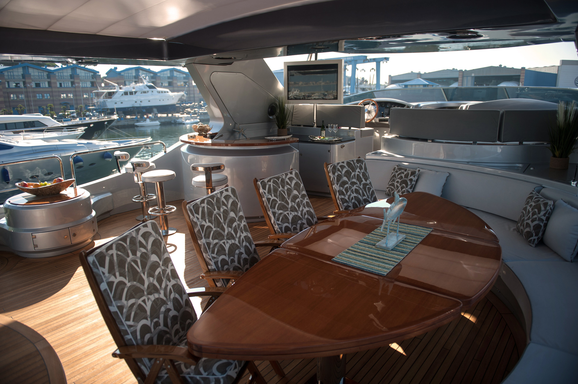 Greet your visitors in the main salon, where rich wooden panelling and matching floors contrast beautifully against the cream furnishings for an environment ideal for social gatherings at any time of the day. The sofas and armchairs are placed aft to receive the most light from the large glass doors, while port and starboard windows increase the amount of natural light. Forward of the lounge is the formal dining area, which seats up to 10 guests for memorable family meals to suit any occasion.