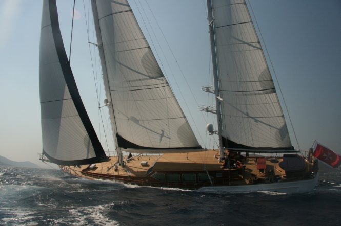Built in 2010 by Turkish shipyard Pax Navi, she has a steel hull and a wide beam of 9m/30ft and the unusual addition for a sailing yacht of a deck Jacuzzi.