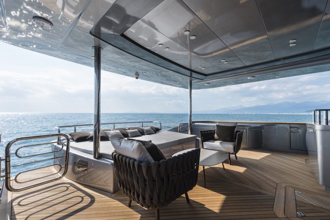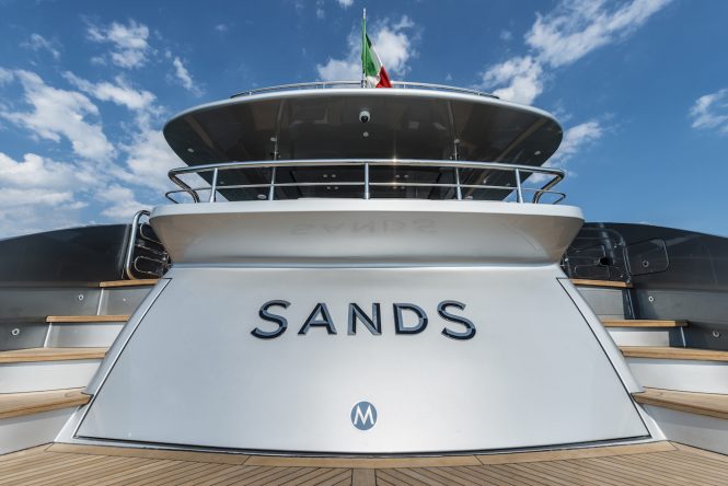 M/Y SANDS has ample exterior decks, perfectly suited to enjoying the West Mediterranean’s enticing weather. The aft deck has partial shade, seating, alfresco dining and sunpads. Further aft an extended swim platform provides charter guests with easy access to the sea and water toys. A bow lounging area offers built-in seating, small tables and sunpads. Above, on the upper deck is alfresco dining, chaise chairs, a wet bar and partial shade.