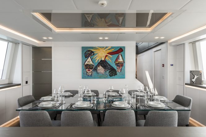 Her lovely interior décor is contemporary featuring soothing grey fabrics, light panelling and bespoke woods. The main salon offers a generous lounge with surrounding panoramic windows and full entertainment systems, ideal for relaxing in ultimate comfort. In a semi-open plan layout there is a formal dining room just forward of the salon, separated by a low island credenza, with a clear glass table and seating for 10. Minimalistic detailing and art give the space an elegant ambiance.