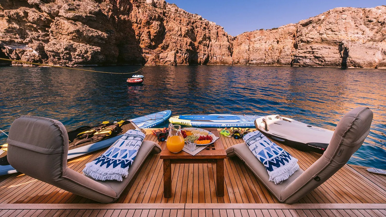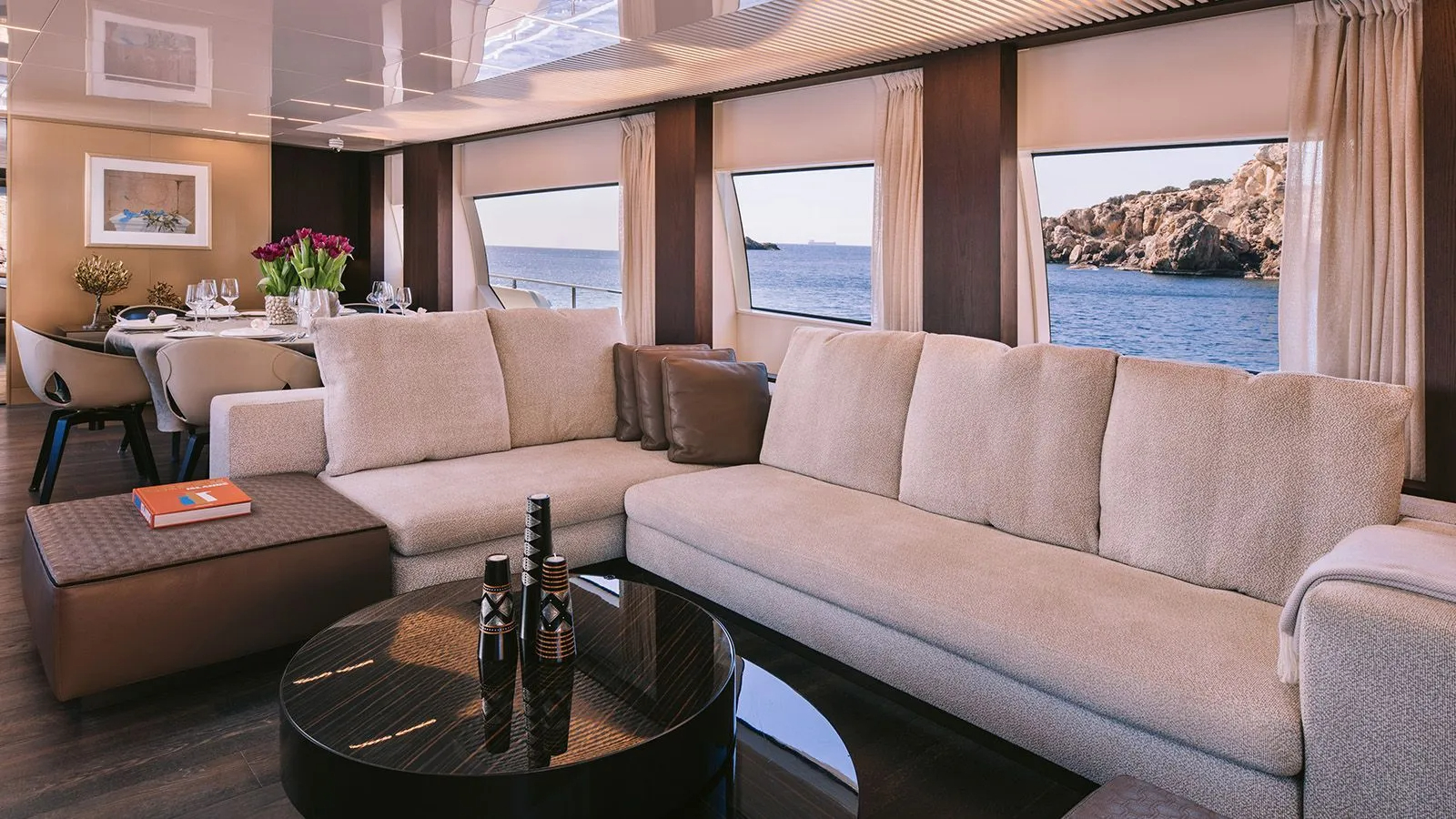 There is a choice of al fresco dining and entertainment space plus plenty of comfortable areas to sunbathe and recharge. Everything on deck is in pristine condition, having been carefully maintained since her launch in 2018, and there are seabobs, efoils and waterskis on board to keep energetic guests entertained in the water. If guests prefer to relax at the water’s edge, a generous swim platform can be set up with sun loungers to create a cool beach club.