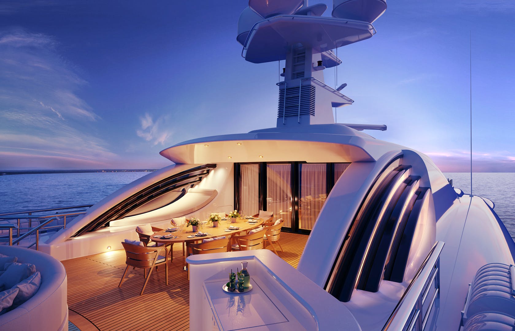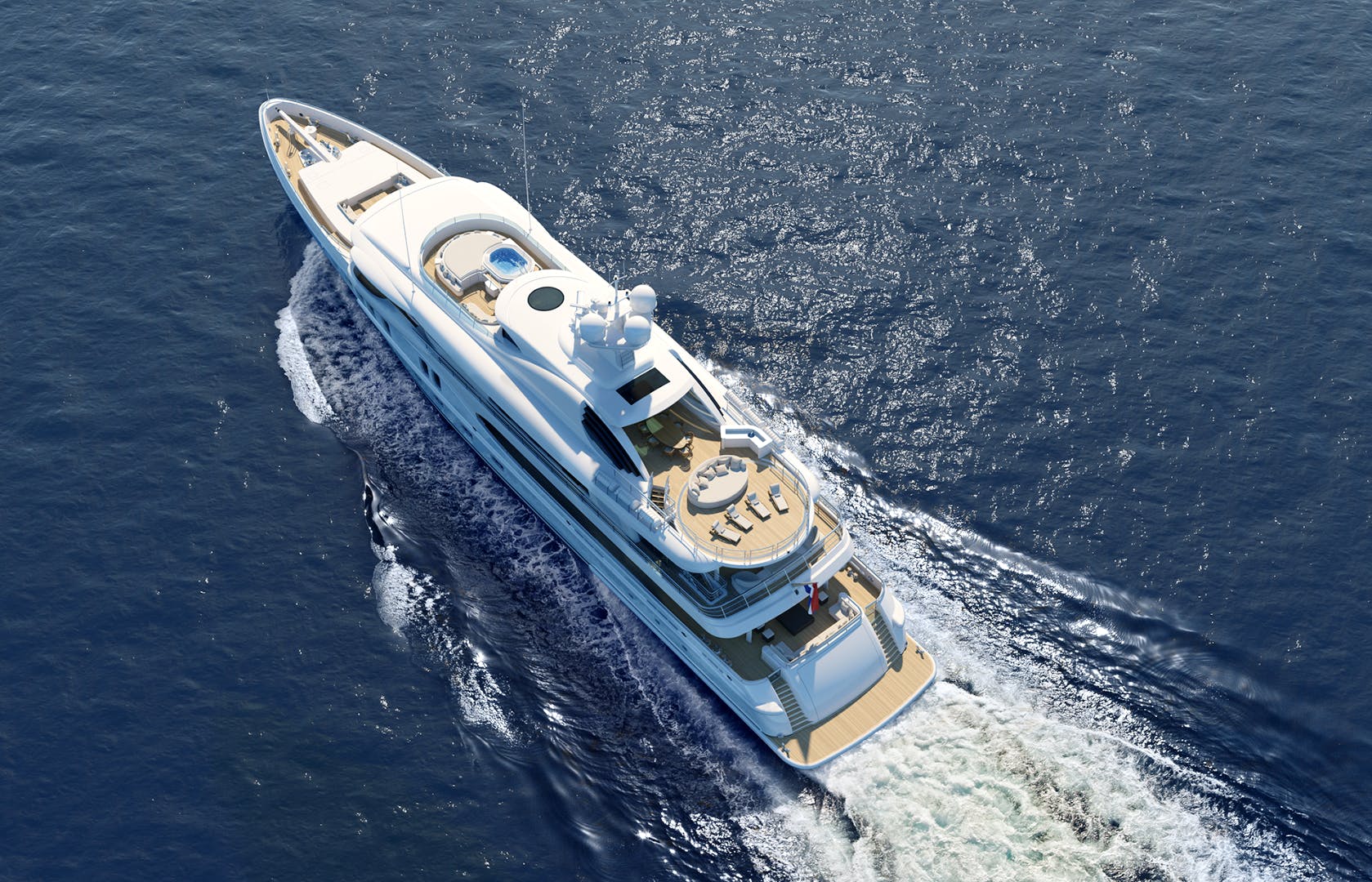 Her design offers multiple deck levels providing a choice of al fresco entertainment spaces zoned for dining, relaxing and exercising with the inclusion of a jet stream swimming pool and sky gym. Her extended swim platform serves as an ideal beach club where the space flows into a bar and lounge including a state of the art entertainment system. Additionally, a shower and day head provide an extra level of comfort for guests after enjoying time on the water.