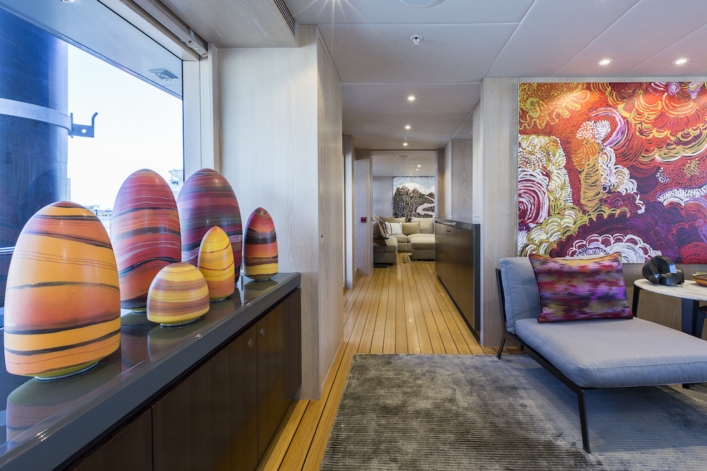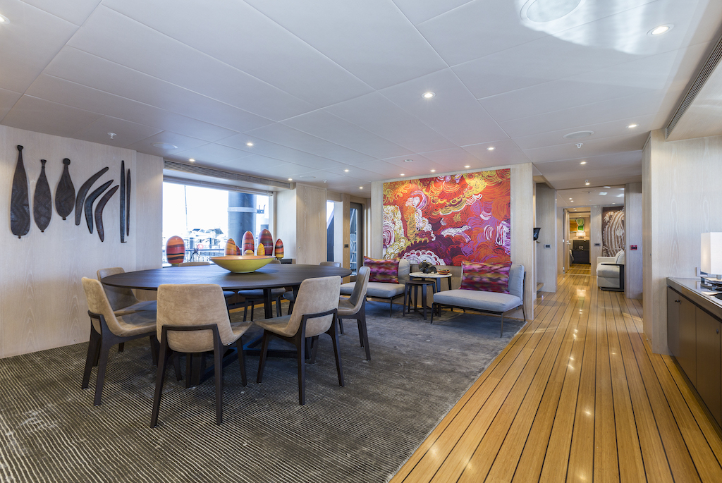 The main salon and dining area comprise a single large space towards the centre and aft of the main deck, brightly illuminated during the day by the large window panels that allow natural light to flood inside. Pale American oak, bamboo flooring and wenge inlays form a bright and natural contemporary environment for guests to gather for coffee mornings, films and relaxation.