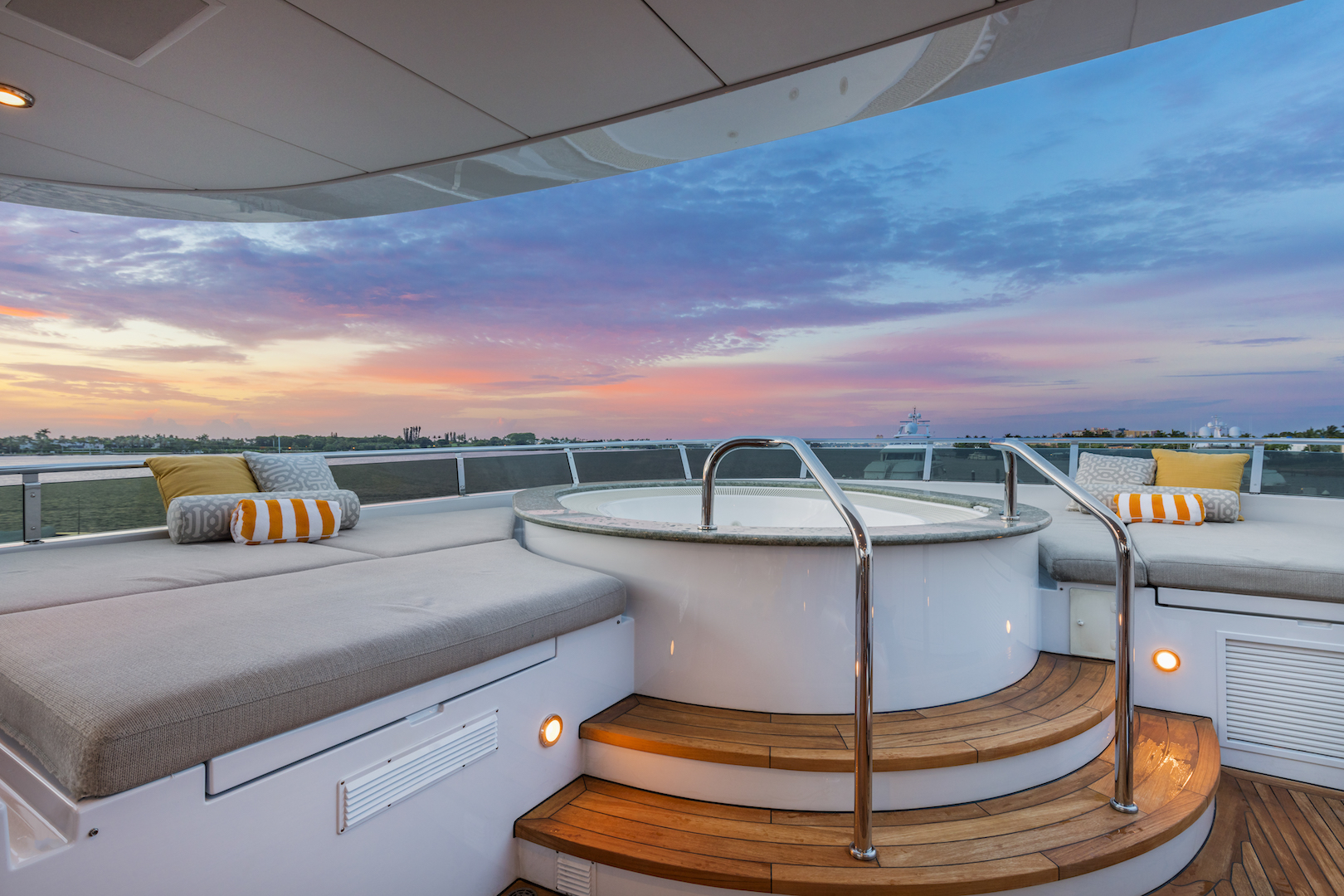 On the sundeck, ease tired muscles in the lavish forward Jacuzzi, lie out in the sun on the aft sun loungers or dine alfresco with refreshments from the bar. Alternatively, the aft can be used as a helipad to ferry guests back and forth.