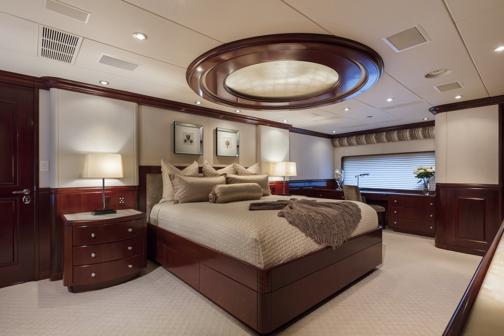 The main salon uses pale and neutral furnishings against deep wooden panelling for a stately appearance. Large windows panes flood the interior with light and the forward formal dining area enjoy the same beautiful surroundings.