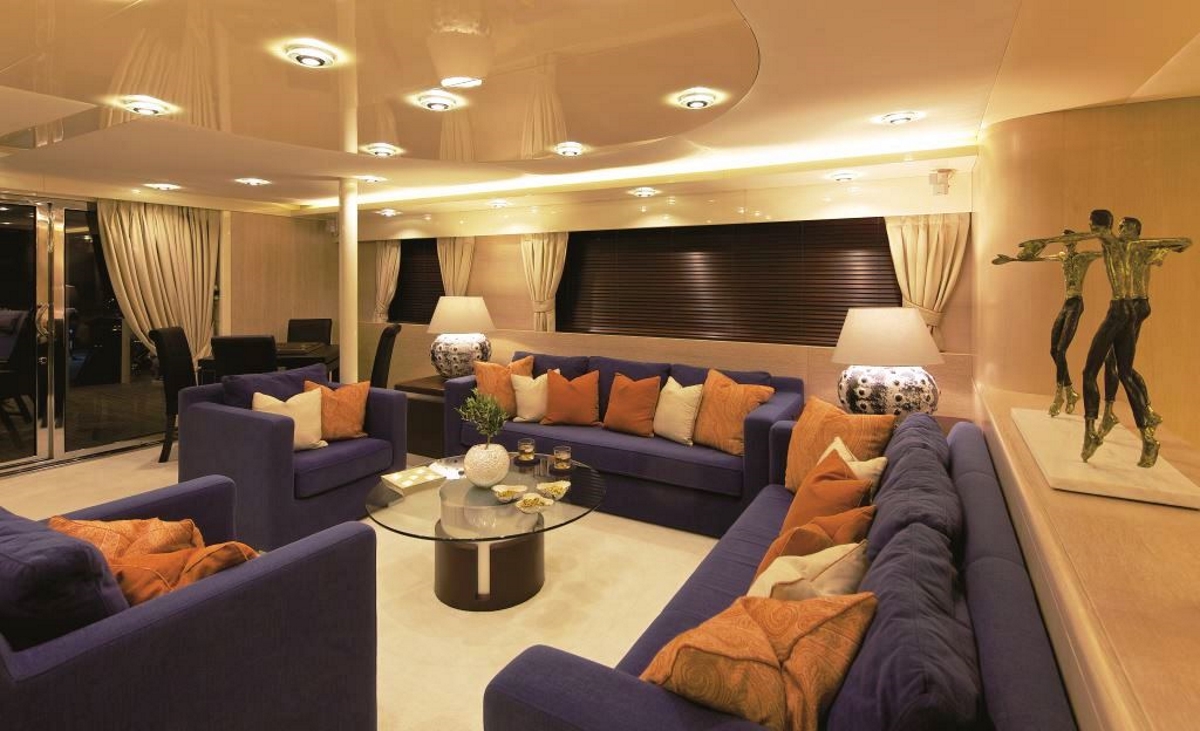 The main salon is is a large and bright space for entertaining among family and friends. The brilliant blue sofas are a focal point for social gatherings and everyone can plan out their activities and prepare before heading off to shop and sight-see among the islands of the Dodecanese or the Dalmatian Coast.