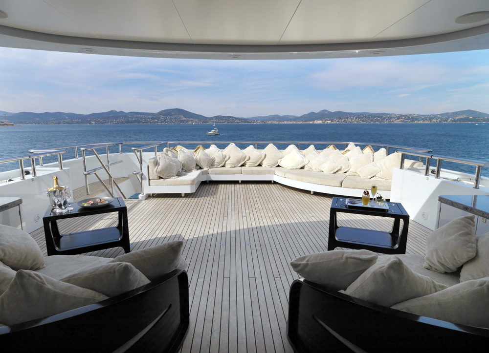 The outdoor lounging area on the main deck aft is a shaded resting spot perfect for those returning from sunning themselves on the generous swim platform, or after playing for hours in the water.