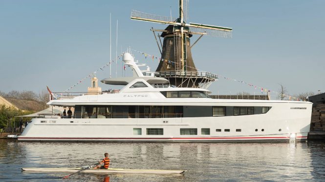 The latest yacht built by Mulder Shipyard, charter motor yacht CALYPSO, has been delivered to her owner at the historic drying-shed of sawing mill Heesterboom with over 130 guests. The 36m motor yacht showed off her exterior designed by Claydon Reeves with naval architecture by Van Oossanen Naval Architects and interiors created by Vickers Studio.