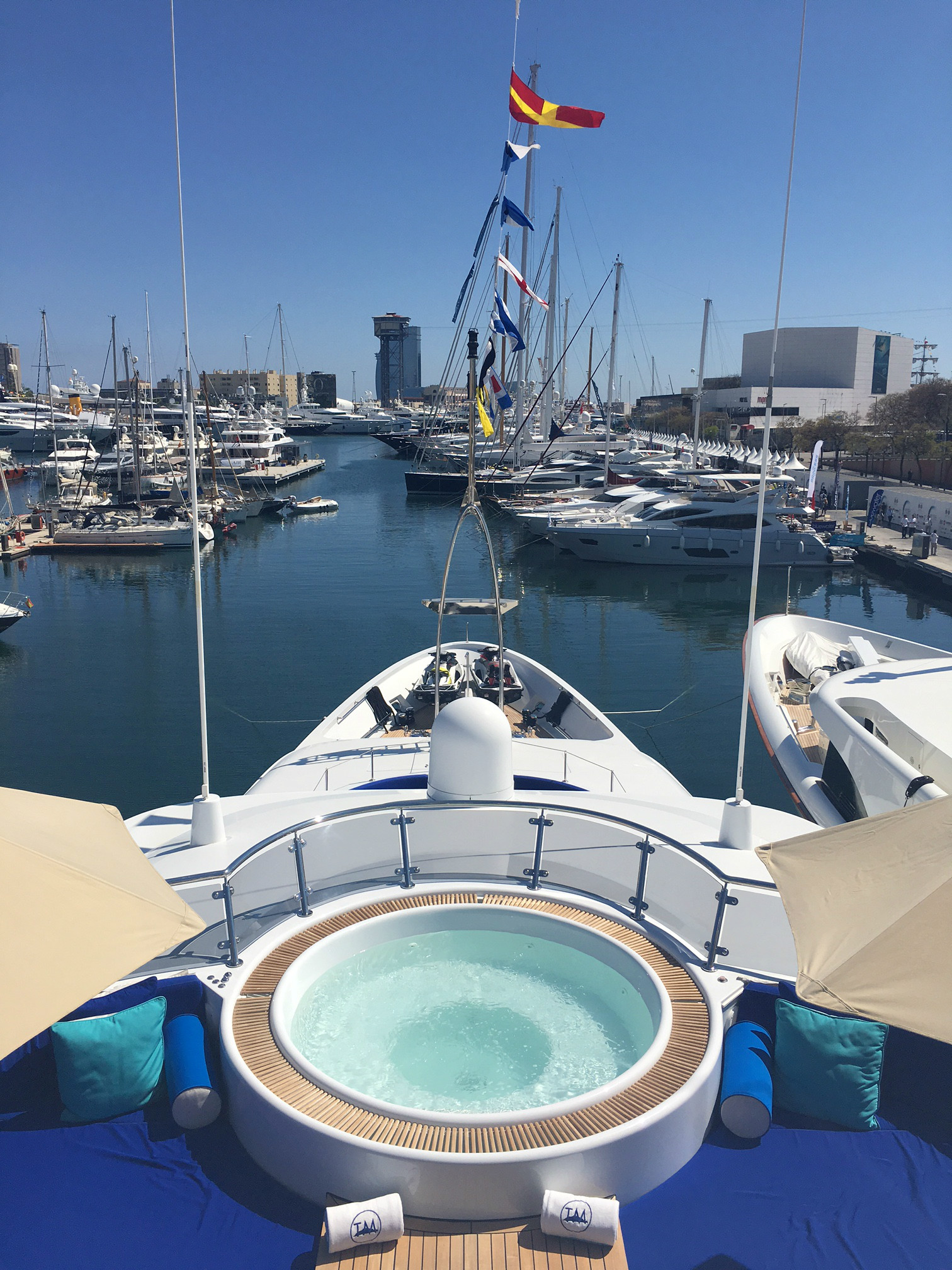 Sundeck spa pool aboard luxury yacht TALISMAN MAITON at the MYBA Yacht Show 2017. Photo credit CharterWorld