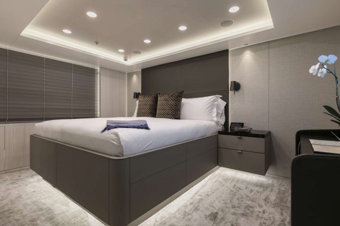 Begin your day together in the superbly decorated main salon, fitted with pale wooden panelling to match the off-white furnishings in a myriad of textures. Accents in orange and blue give a burst of colour to the interior and draw the eye from the aft lounge to the forward formal dining area, where there is a large wine cellar able to stock up to 220 bottles for a special celebration.