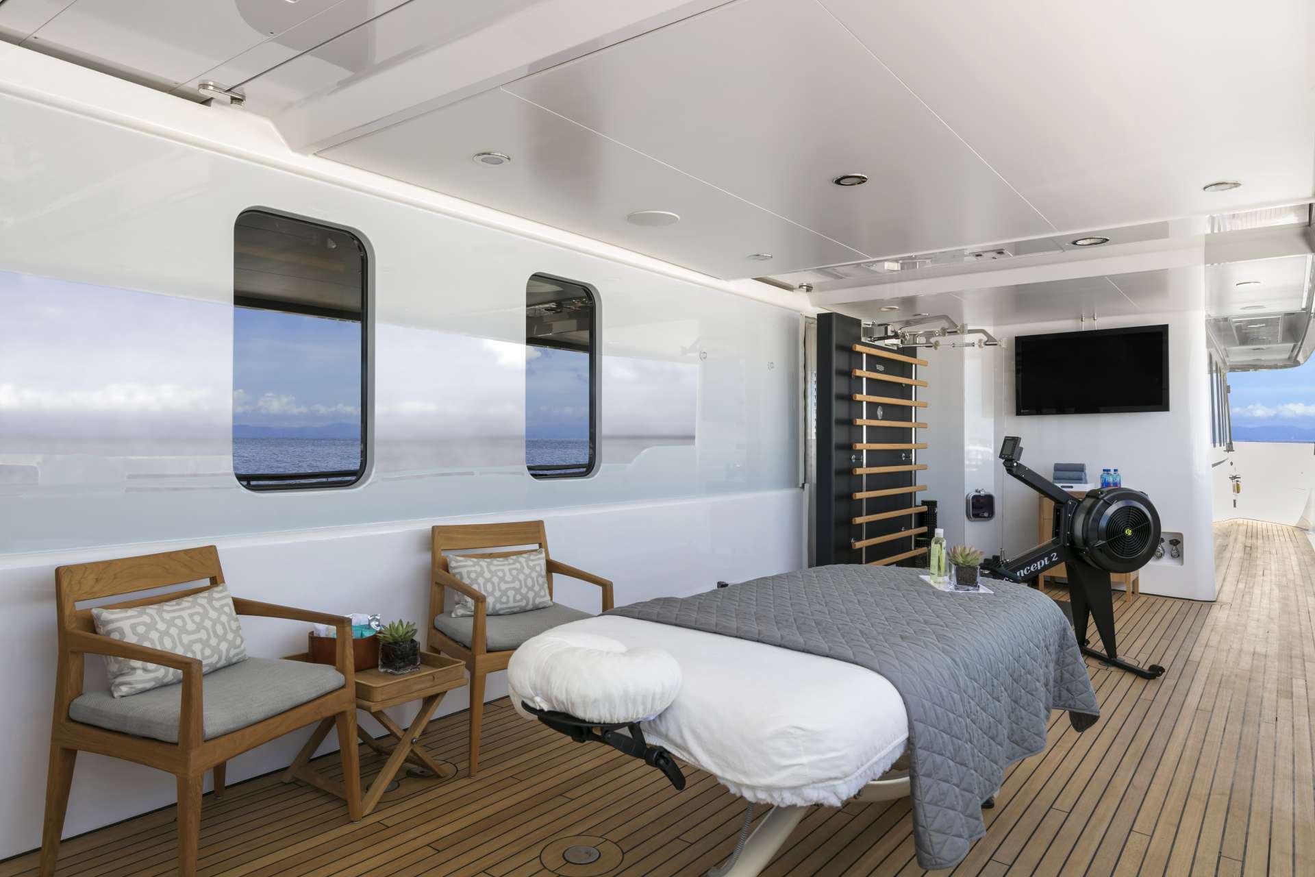 The upper deck has an outdoor gym for guests to exercise in the fresh air while cruising to the next beautiful beach.