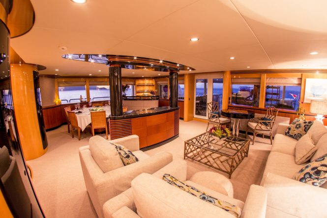 The interior décor is contemporary and elegant, using warm woods and neutral fabrics, creating a serene ambiance for guests to relax. Her main salon is open plan, with the sumptuous lounge to port and formal dining to starboard, spanning over her 35’ beam. Forward are 4 guest cabins on the main deck, while the upper deck hosts the generous master stateroom.