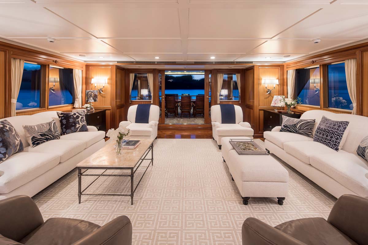 Eight guests can be welcomed on board in four staterooms including a full beam master with his-and-hers bathroom, a queen with spa bath and a twin with steam shower. The fourth stateroom is on the main deck and is convertible to a suite from the library.