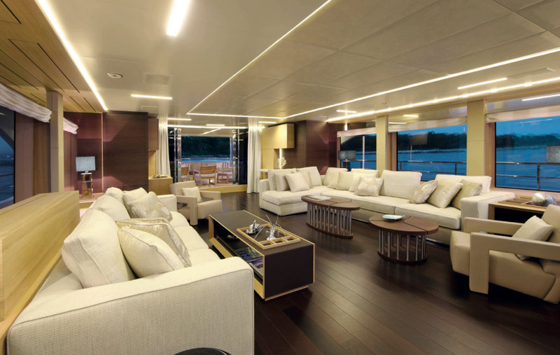 The interior design is autographed by Francois Zuretti, in collaboration with the yard’s internal design team. The interior furnishings of Petrus II are of natural oak and wengè, enriched with handmade leather inserts. Other special materials are also used: structural wengè to give a three dimensional effect, diamond shaped panels in ivory colored natural leather in the owner’s and the VIP cabins rise from behind the head of the berths and continue up to the ceiling, while in other spaces, like the main salon, there are recessed ceiling lights. A mix of marble, leather finish and mosiacs are used in the heads. As always, Benetti interiors are completely customizable.