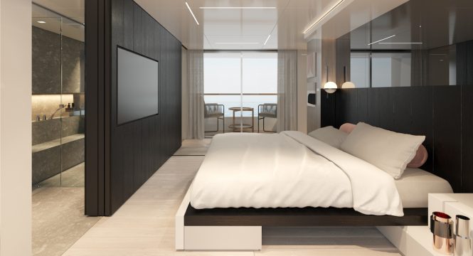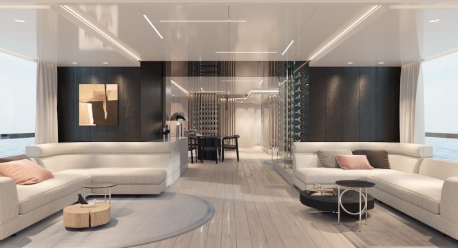 The main deck amidships to starboard has a wine cellar that acts as a divider between the shared living spaces and the Owners’ stateroom, where there is a glass sliding door out onto a fixed side balcony, which ensures that the occupants can use the space without the help of the crew.