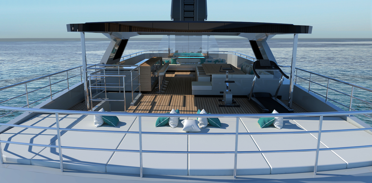 The broad sundeck meanwhile hosts a large alfresco dining table, a corner bar and Jacuzzi with a waterfall feature, plus two showers on the sides.