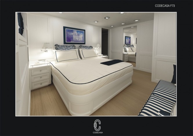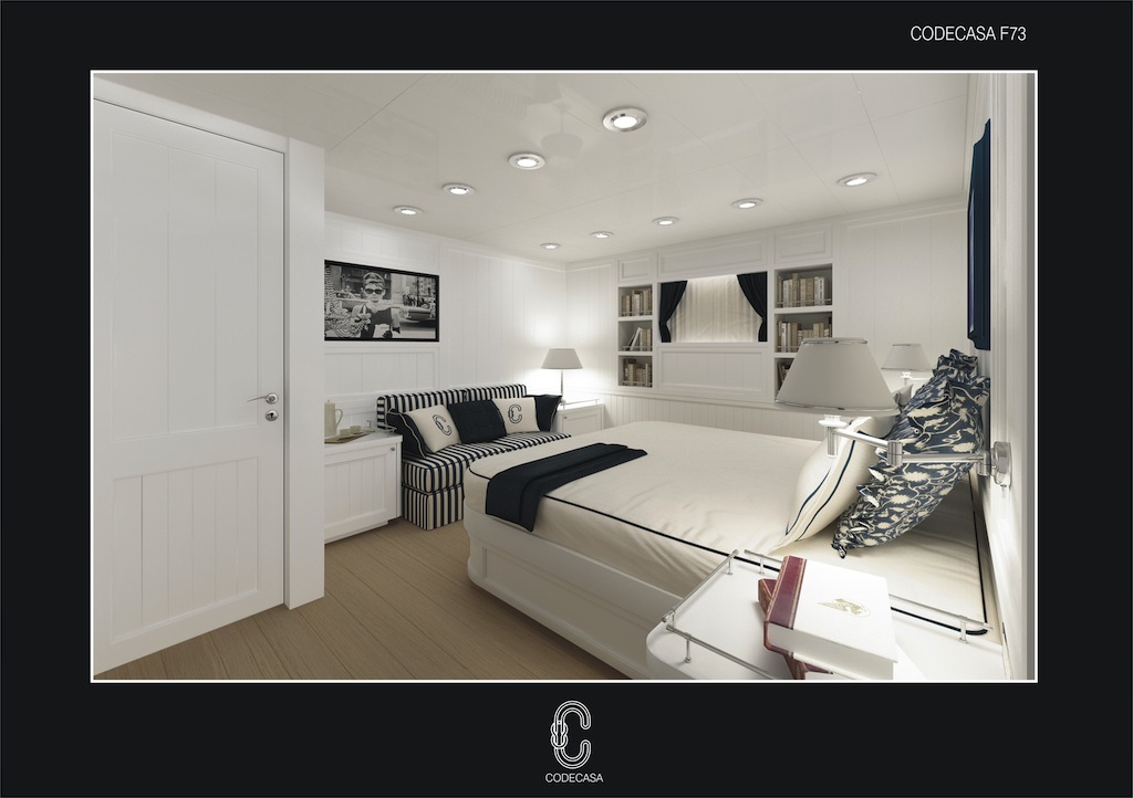 Codecasa F73 superyacht’s lines with a faintly retro taste co-exist with a forefront technology; the safety of this F 73 hull is assured by last generation outfits goes together with a d’antan style that is still able to rouse new and exciting emotions; the richness of its precious materials matches with an intentionally simple and decontracté design, which is entrusted to Arch. Della Role, with whom the Codecasa Shipyard since years has developed an active co-operation.
