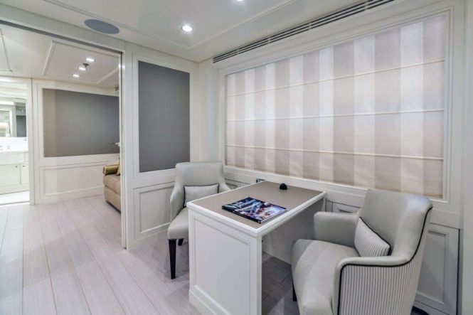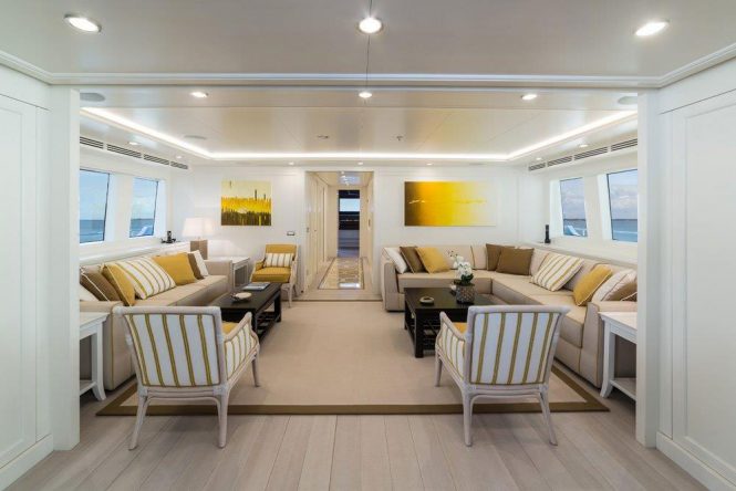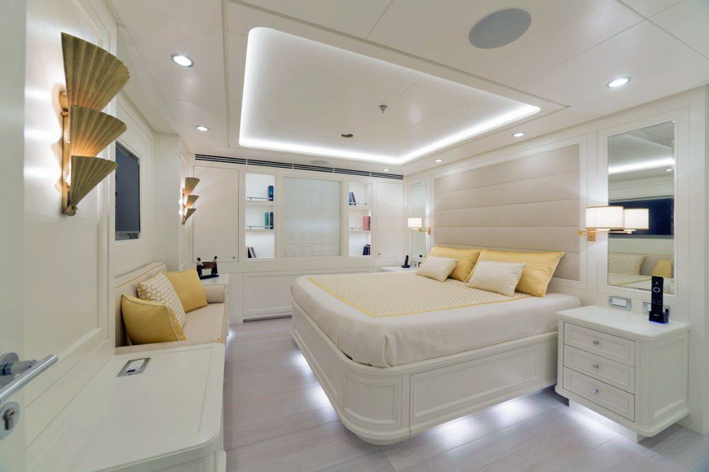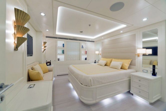 The superyacht accommodates up to 10 guests (1 Master suite, 2 double cabins and 2 twin cabins, all with en-suite facilities) as well a crew of 9 within an interior volume measuring just under 500 GRT. Each spacious cabin uses the same warm and bright colours, enhanced by bespoke decorations including lamps and original artwork.