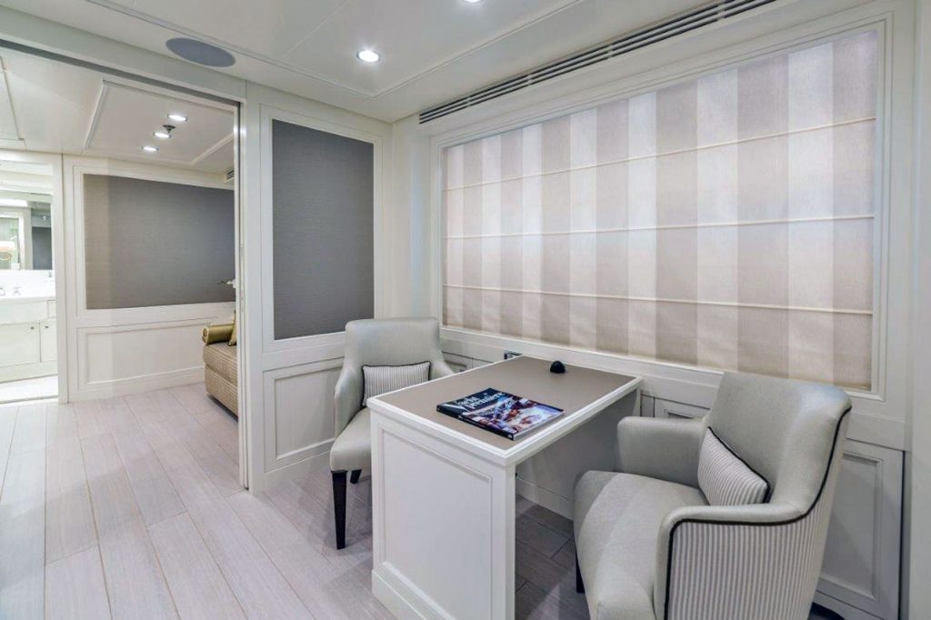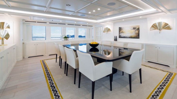 The interiors use a contemporary colour scheme of glistening white and metallic gold, further accentuated by silver and charcoal furnishings. The large open-plan layout forms a C-shaped aft seating area close to the port-side windows, leaving room adjacent for a bar. In the forward section of this space is a large dining table designed to seat all 10 guests surrounded by modern art work continuing the established theme.