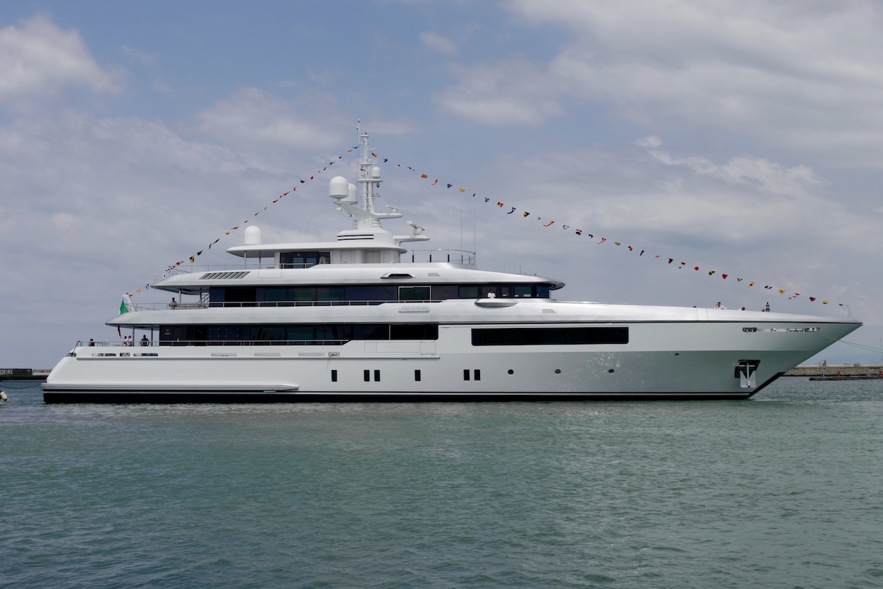 The private launch ceremony took place on the 18th of July at 11.30 am at the production facility along Darsena Viareggio. HULL C123 measures 55m/180ft and spans four decks, with a lift (elevator) providing easy access from the accommodation up.