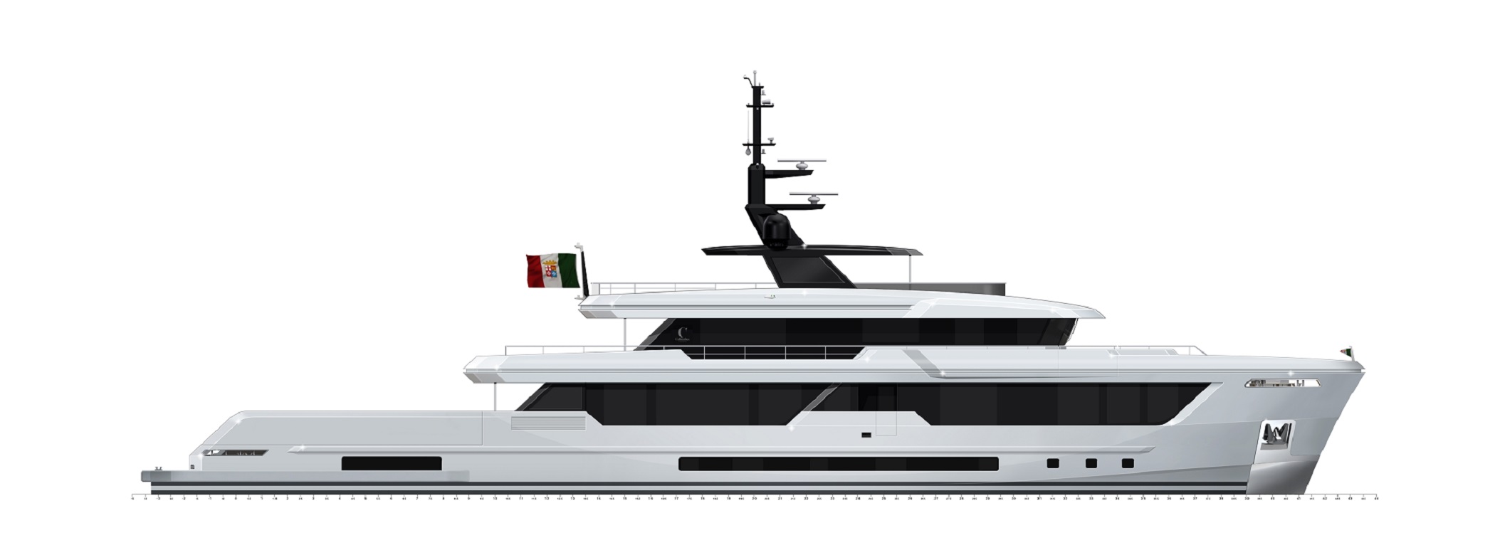 The exterior is characterised by modern and muscular shapes including a bulbous bow which has the greatest concentration of volume – typical of explorer yachts. Every element has been designed to adapt to the needs of the owner with the stern being equipped to carry a substantial tender and having the ability to transform into a water’s edge terrace with additional fold out sections. On the sun deck, in addition to spacious sunbathing and relaxation areas, a large bar and a second swimming pool have been planned.