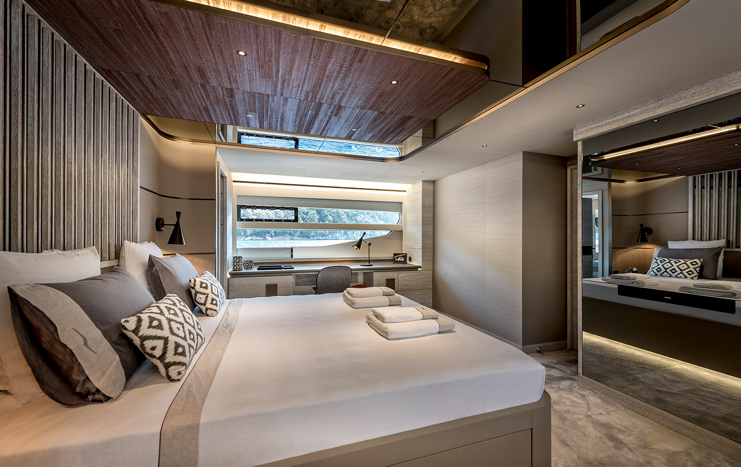 The interior spaces are refined and welcoming with wooden floors stretching through the main deck, softened with rugs, plush sofas and an informal dining table. There is an easy connection between the galley and the dining area making it seamless for the crew to serve delicious cuisine from the on-board chef.
