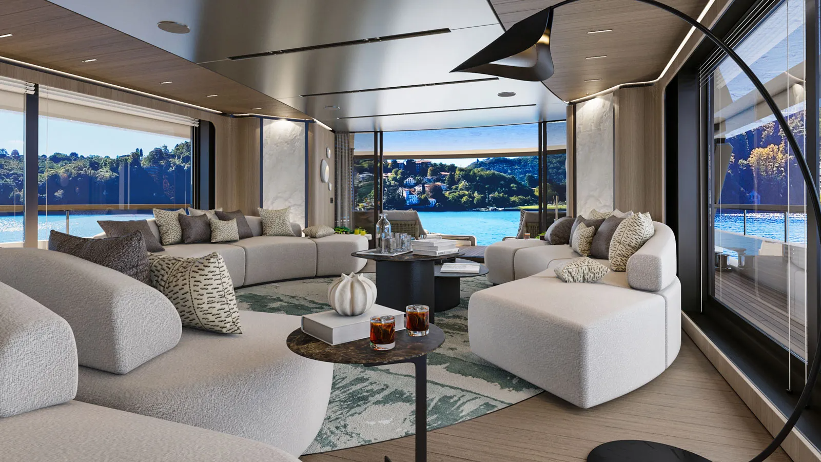 Guest accommodation is across four lower-deck staterooms including two VIP cabins featuring transverse beds. The suggested arrangement focusses on an owner’s cabin at the bow, designed to provide direct access to the private forward terrace.