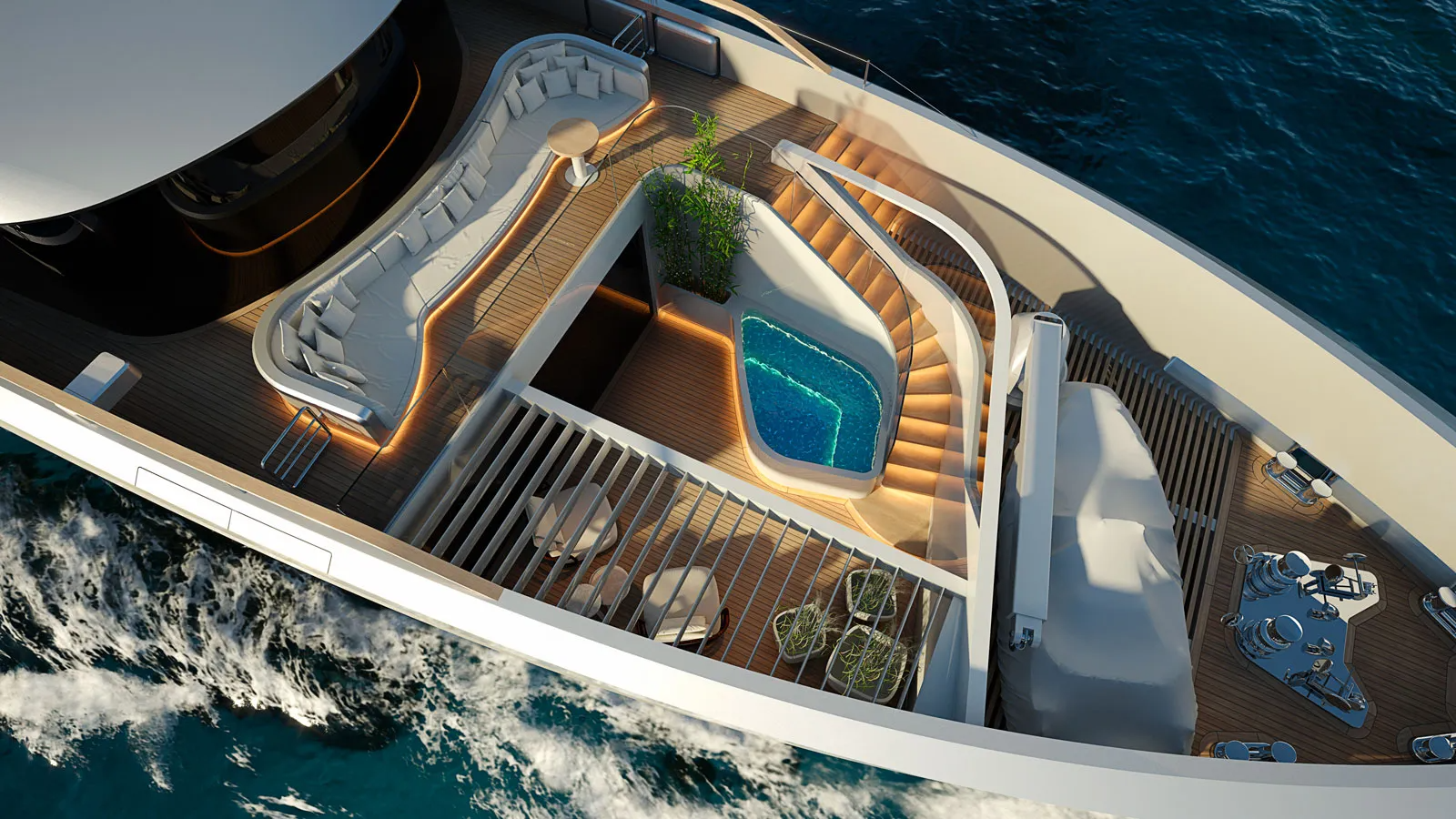 Exterior renderings reveal an al fresco dining area on the sundeck and casual sofa seating on the main deck – both providing uninhibited views across the stern. The aft deck is home to a large pool surrounded by sunpads, sun loungers and additional fold-out terraces. There is also plenty of onboard storage for tenders and toys.