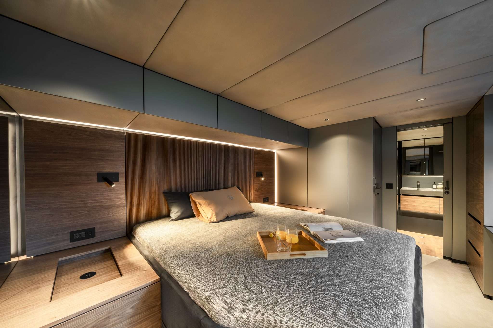 With her stylish good looks both inside and out, she will turn heads in the harbours with her dark grey paintwork and delight her guests with her luxurious, high-end finish. The blend of dark grey panelling and warm wood finishes plus neutral soft furnishings on deck and in the salon present a contemporary atmosphere. Solar panels across the hard roof make the design the future of sustainable yachting.