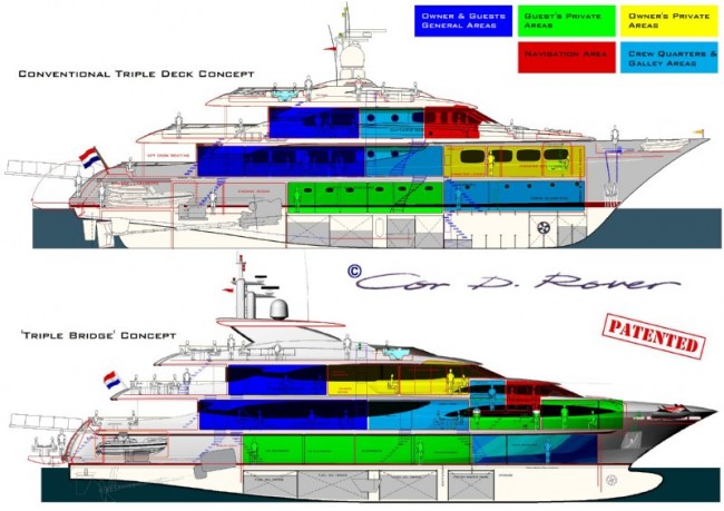 Cor D. Rover, a Dutch design studio specialised in styling of large motor yachts has developed and patented a new concept for yachts under 500 Grt. called the ‘Triple Bridge Concept’. The goal was to design a range of yachts from 33 –50m, under 500 Grt. offering owners and guests space normally found on much bigger yachts for less building, running-and manning costs.