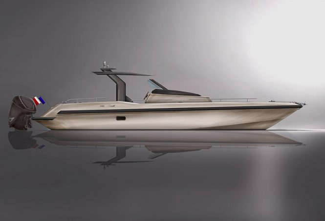 The layout features two sunbathing areas placed on the bow and the stern, while the helm will have a shaded hard-top seating area plus two large sofas facing one another with removable tables to meet guests’ requirements. Inside, a double cabin has en-suite facilities of a day head and shower.