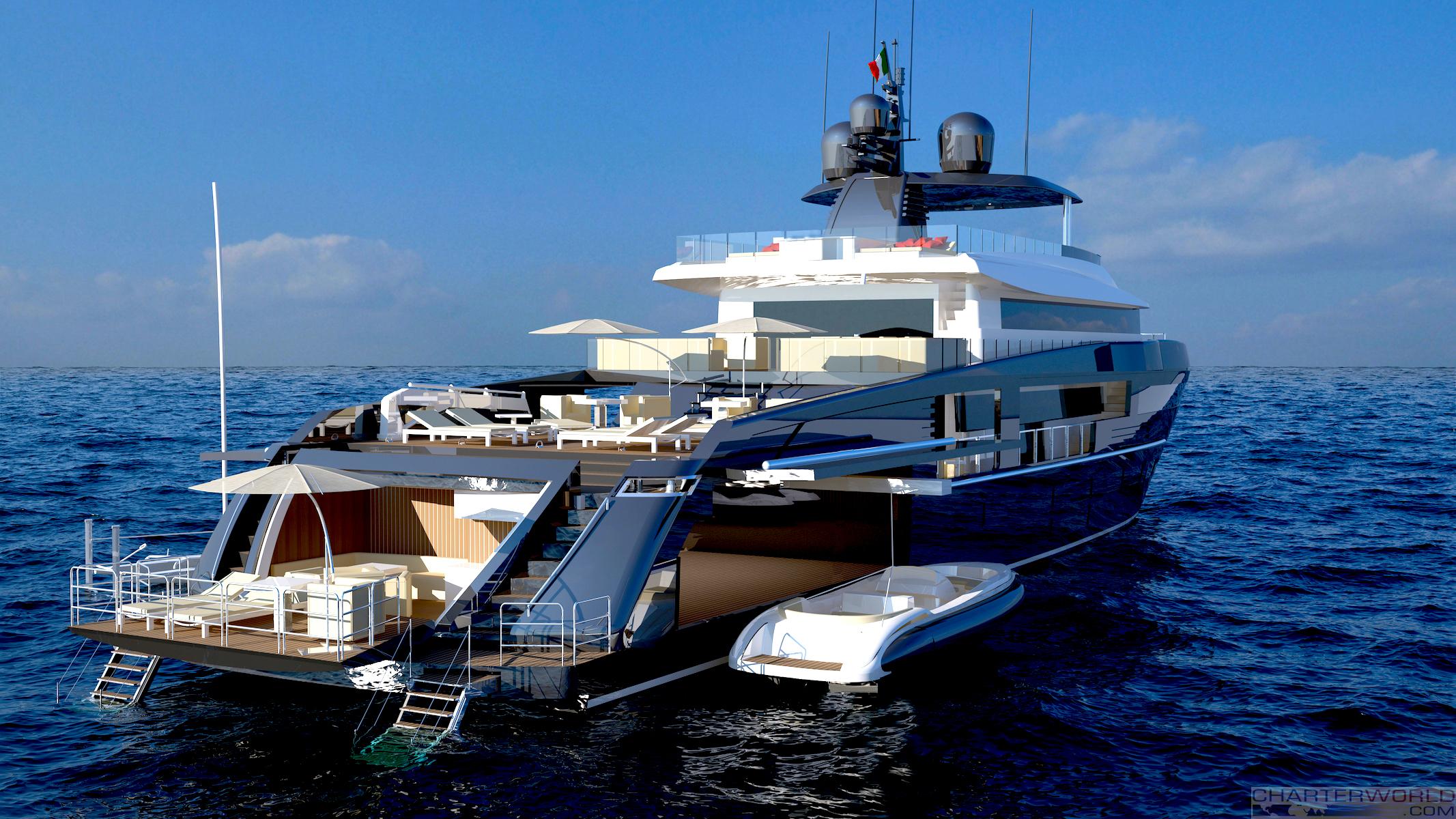 The Sport Utility Yacht series by Oceanemo provide a distinctive feature of wide and open spaces on board. Their design allows to store a large amount of tenders, amenities and toys in covered and open-air areas. In fact, offering a full-beam 105 sq m hangar below the 126 sq m half-raised main deck means that Oceanemo 55 yacht has the largest storage capacity currently available on the market.